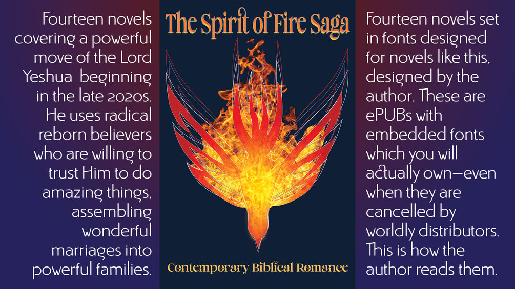 You are buying fourteen high quality ePUBs with embedded fonts with the fourteen novels of the Spirit of Fire Saga.